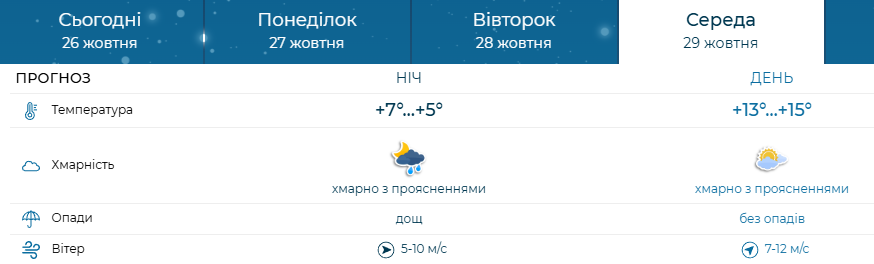 У середу, 29 жовтня, погода суттєво не зміниться. Також буде хмарно, але без дощів.