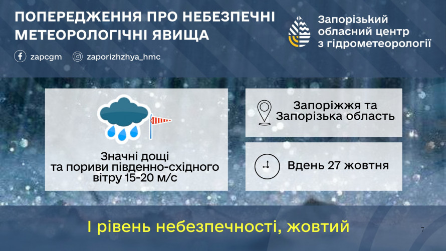 За повідомленням Запорізького обласного центру з гідрометеорології, у понеділок, 27 жовтня, очікуються значні дощі, пориви південно-східного вітру 15-20 м/с (І рівень небезпечності, жовтий).