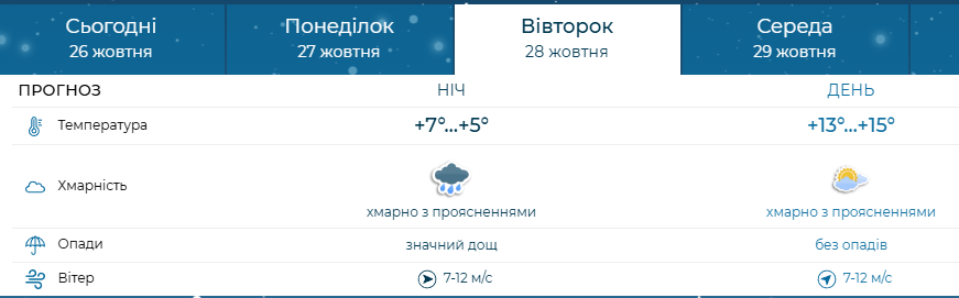 У вівторок, 28 жовтня, температура вдень коливатиметься від +13 до +15. Буде хмарно, проте опадів не прогнозують.
