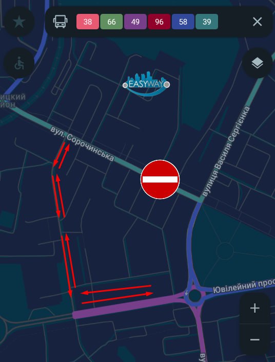 «В районі вул. Сорочинська перекрито рух транспорту. Автобуси №№ 38, 39 рухаються в об'їзд вулицею Козака Бабури».