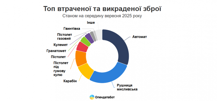 Більшість втрат — це нарізна зброя, понад 52%. Гладкоствольна становить 28%, решта припадає на травматичну, під гумову кулю, газову та інші категорії. Понад половина зниклої зброї — іноземного виробництва: 58% від загальної кількості. Ще чверть — невідомого походження, і лише 17% — вітчизняна.