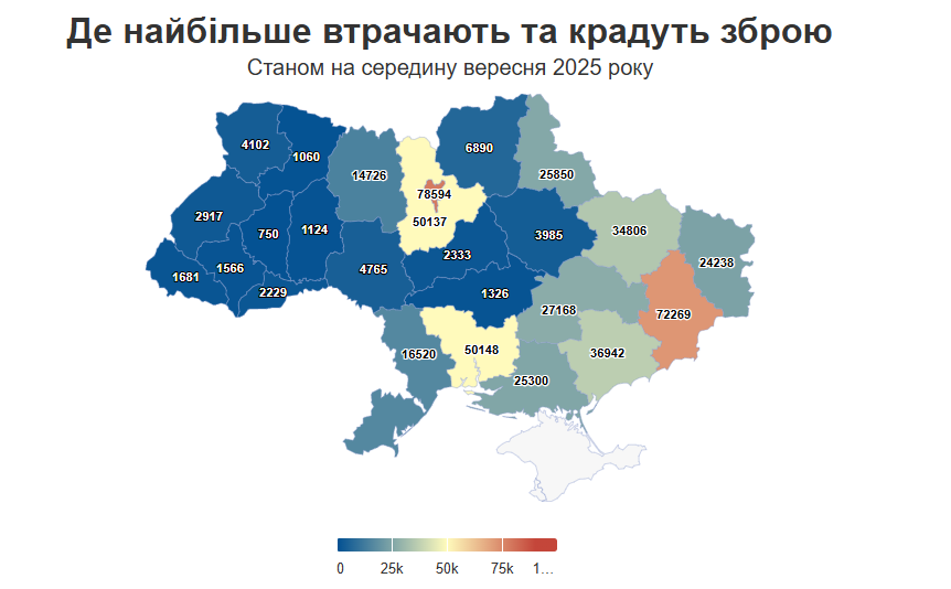 За даними МВС, по всій Україні з початку вторгнення зареєстровано понад 491 тисячу випадків втраченої або викраденої зброї. Лише за останній рік кількість випадків майже подвоїлася — у вересні 2024 року у реєстрі було близько 271 тисячі, зараз — майже пів мільйона.