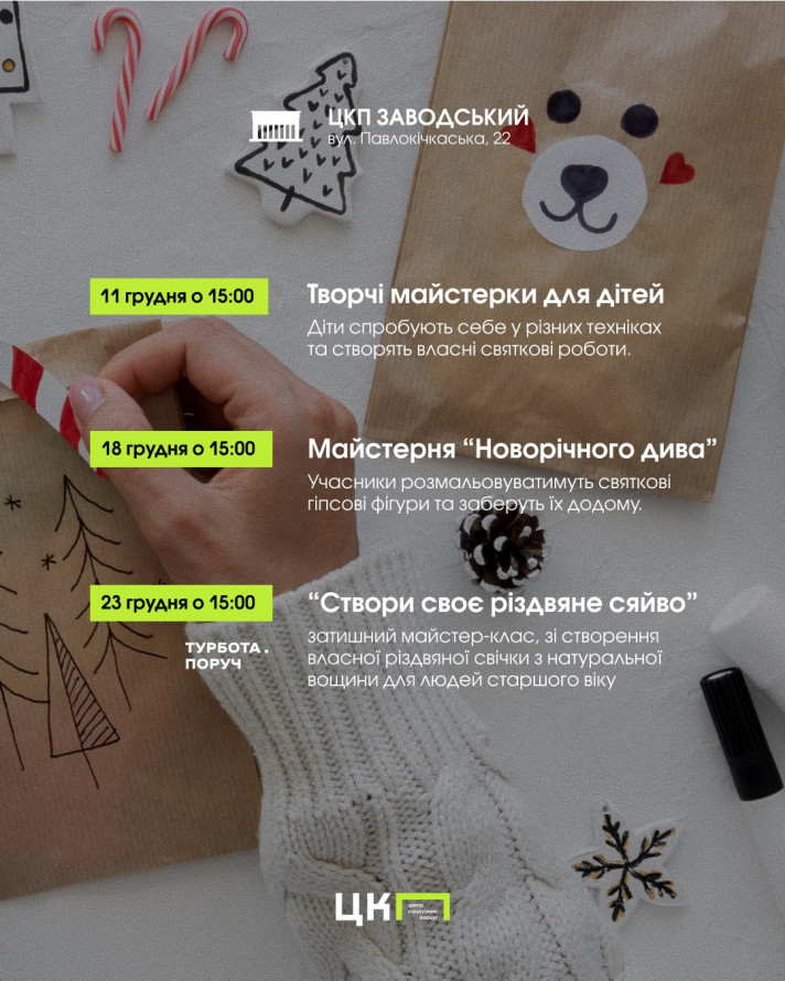 - 18 та 23 грудня - святкові майстерки у ЦКП "Заводський" та ЦКП "Молодіжний". Вхід вільний. Деталі за датами й часом - на картках нижче.