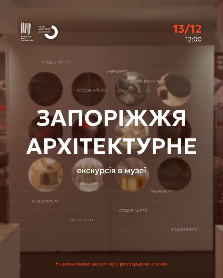 - 13 грудня о 12:00 - екскурсія "Запоріжжя архітектурне" у Музеї архітектури Запоріжжя. Безкоштовно, за попередньою реєстрацію (як зареєструватись читайте нижче)..