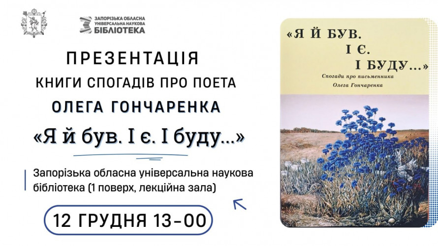 - 12 грудня о 13.00 - презентація книги спогадів про поета, публіциста, перекладача, члена Національної спілки письменників, уродженця Мелітополя Олега Гончаренка "Я й був. І є. І буду...".