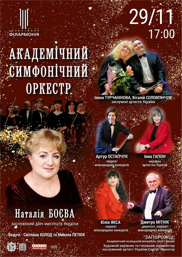 У Запорізькій обласній філармонії, на сторінці фейсбука, опублікували добірку з трьох концертів, які варто відвідати у листопаді – концерти «Європейський вояж», фольклорне свято «Барвиста круговерть» і програму творів відомої запорізької композиторки Наталії Боєвої.