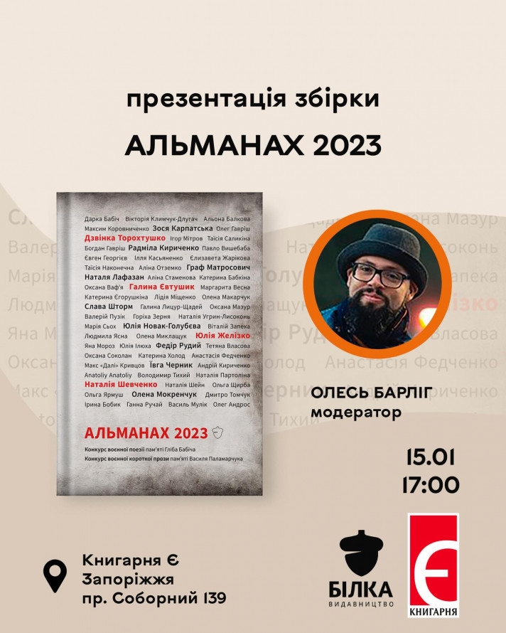 - 15 січня о 17.00 - презентація збірки "Альманах 2023" у "Книгарні Є" (просп. Соборний, 139).