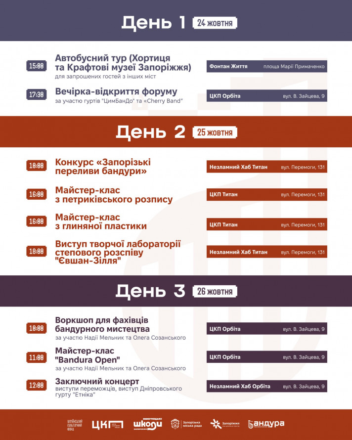 Протягом трьох днів, з 24 до 26 жовтня, місто перетворюється на інтерактивну платформу для майстер-класів, воркшопів, концертів та турів культурними локаціями Запоріжжя. Перший день форуму відкрився яскравим виступом харківського гурту «ЦимБанДо», який поєднав різні музичні жанри у кросовер-шоу. Також на сцені виступив енергійний молодіжний колектив «Cherry Band», демонструючи, що українська музика не знає кордонів.