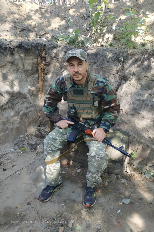 «Ми отримали зброю, волонтери знайшли мені бронежилет, і наступні кілька місяців ми охороняли лісисту ділянку на Броварському напрямку. Потім стояв на кордоні з Білоруссю, а після повернення до Києва перевівся у 128-му бригаду ТрО. З вересня — у зоні бойових дій, мінометником», — зазначається в його розповіді.