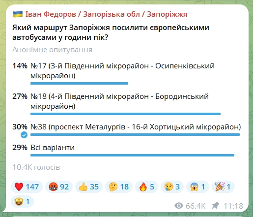 Найбільше голосів зібрав тридцять восьмий маршрут, що курсує від проспекту Металургів до 16-го Хортицького мікрорайону.