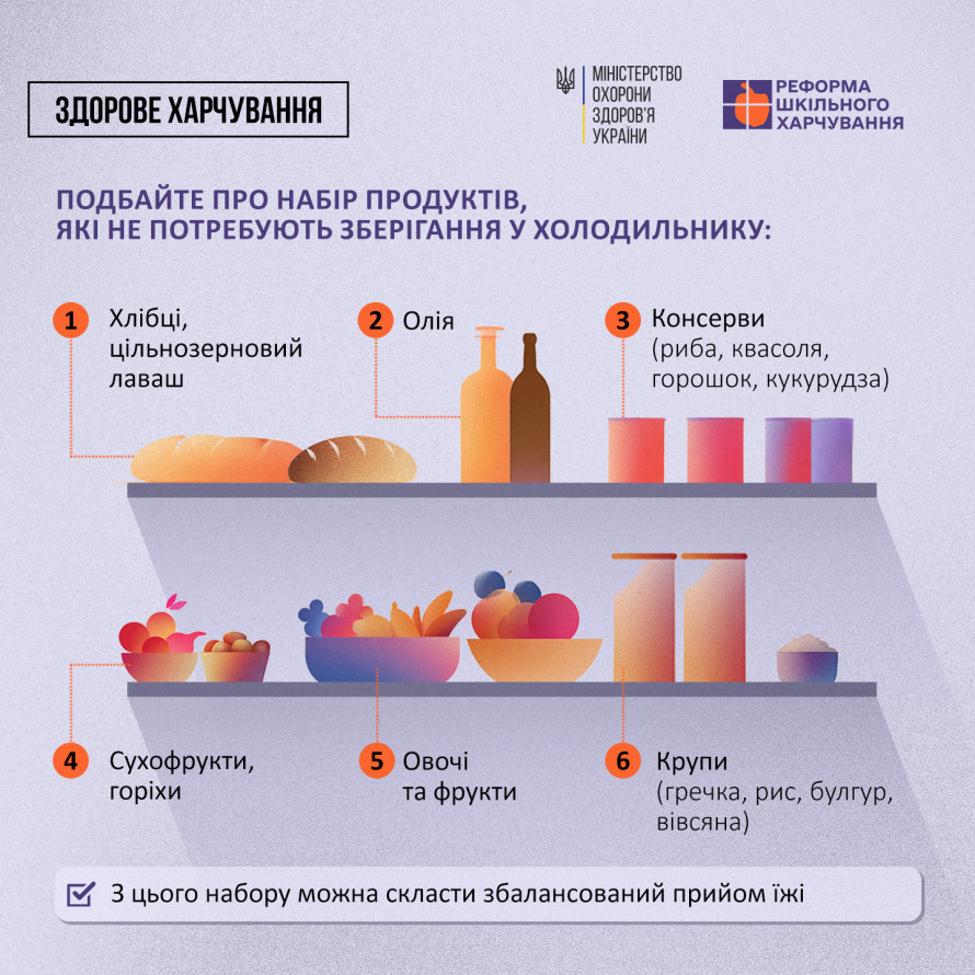 Подбайте про запас продуктів, з яких можна скласти збалансований прийом їжі без використання холоду: