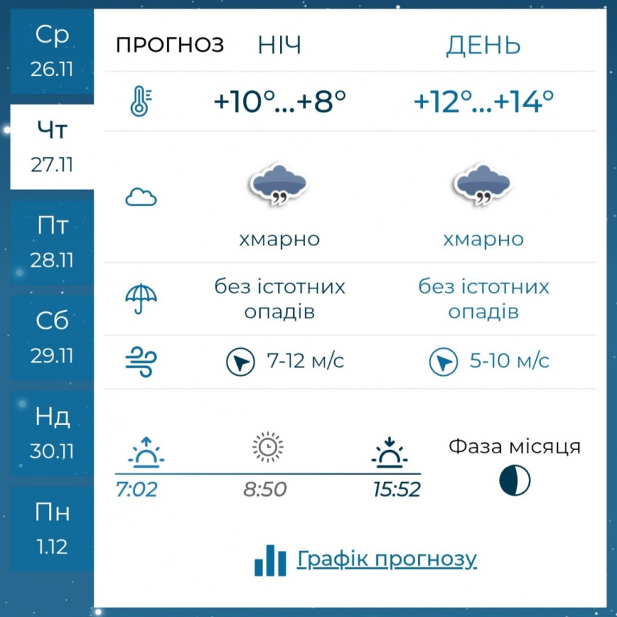 У четвер, 27 листопада, атмосфера над регіоном буде насичена вологою, проте дощові хмари оминуть край. Протягом доби — хмарно, без істотних опадів. Вночі температура триматиметься на рівні +8…+10°C. Південно-східний вітер приноситиме легкі пориви 7–12 м/с.