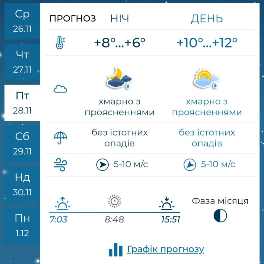 П’ятниця, 28 листопада, також не готує нічого мокрого. Хмари й далі домінуватимуть на небі, хоча місцями можливі невеликі «прорізи» світла. Вітер матиме змінний характер: уночі — західний 5–10 м/с, удень — північно-східний із тією самою швидкістю.