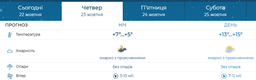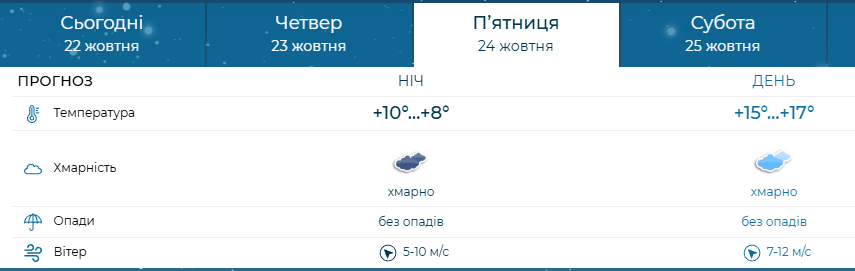 У ніч на п’ятницю температура підвищиться до +10…+8°, без опадів, вітер 5–10 м/с. Вдень стане ще тепліше — до +15…+17°, небо буде хмарним, але без дощу.Вітер 7–12 м/с.