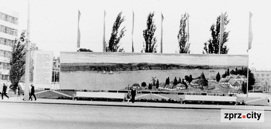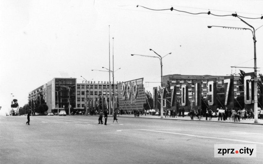 У ті дні нинішня площа Фестивальна мала ось такий святковий вигляд. Ще ні будівлі обкому (тепер облдержадміністрації), ані «Інтуриста» не було. Зліва від Головпоштамту можна побачити повсюдного Леніна з привітом. Того року з розмахом відзначили його 100-річчя, тож Запоріжжя певною мірою продовжило естафетний порив.