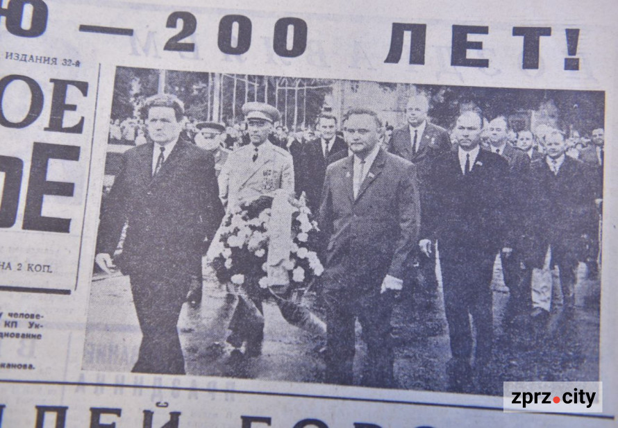 От і вчора квіти до підніжжя пам'ятника Іллічу поклали члени бюро обкому та міськкому КП України, облвиконкому та міськвиконкому, представники всіх районів обласного центру, численні гості, які приїхали на святкування 200-річчя Запоріжжя».
