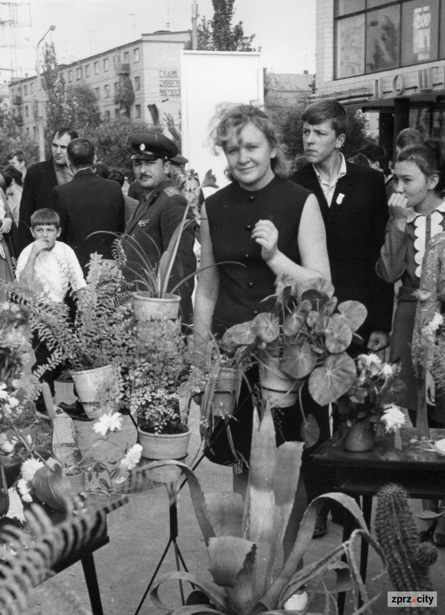 Повертаючись до квітів, зауважимо, що проходила в ті дні і цілком демократична їх виставка. Влаштували квітковий вернісаж біля Головпоштамту. Картинку з цієї виставки зафіксував запоріжець Микола Беренштейн, чиє фото ви бачите нижче.