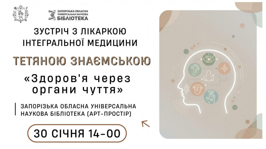 - 30 січня о 14.00 - зустріч з лікаркою інтегральної медицини Тетяною Знаємською "Здоров'я через органи чуття".