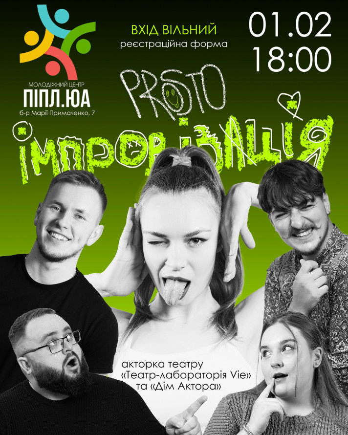 - 1 лютого о 18.00 - комедійна імпровізація від коміків Простору подій ”PROSTO”. Гостя - акторка Дому актора (театр-лабораторія "Vie") Анастасія Гусліста-Полозун (головна роль у виставі "Сім перших робіт Аліни").