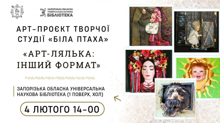 З 4 лютого виставка "Арт-Лялька: Інший Формат" майстри авторської ляльки творчої студії "Біла птаха" (Запоріжжя).Відкриття 4 лютого о 14.00. Вхід безкоштовний.