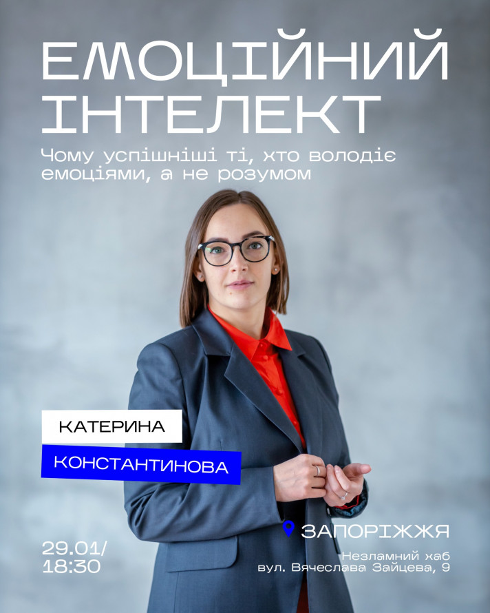 - 29 січня о18.30 - лекція "Емоційний інтелект від архітекторки людських систем, консультантки бізнесу, влади та громадських організацій, тренерки, коуча, КПТ-консультантки Катерини Константинової. У Незламному хабі (вул. Вячеслава Зайцева, 9)