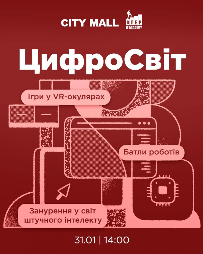 - 31 січня о 14.00 - захід "ЦифроСвіт" від ТРК "CITY MALL" та комп'ютерної академії IT STEP: зона віртуальної реальності, батли роботів, ігри з робособакою, майстер-клас з анімації фотографій за допомогою штучного інтелекту.