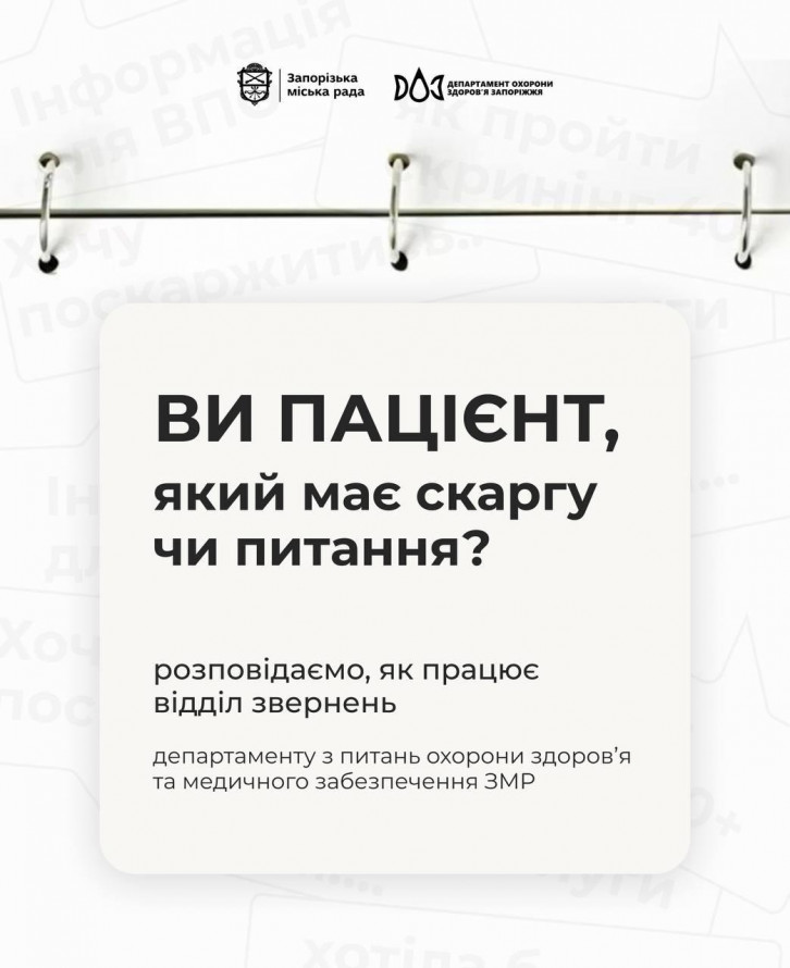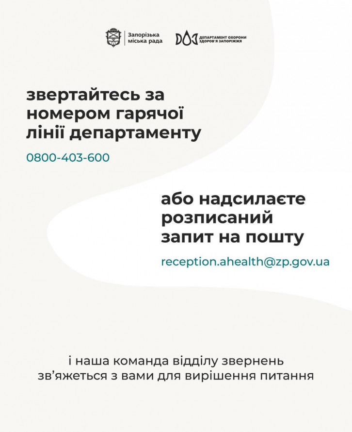 Щоб ви не шукали відповіді самостійно у Запоріжжі працює відділ звернень департаменту з питань охорони здоров’я та медичного забезпечення міської ради. Про це повідомили на сайті Запорізької міськради та зазначили: