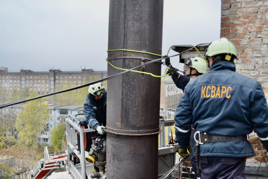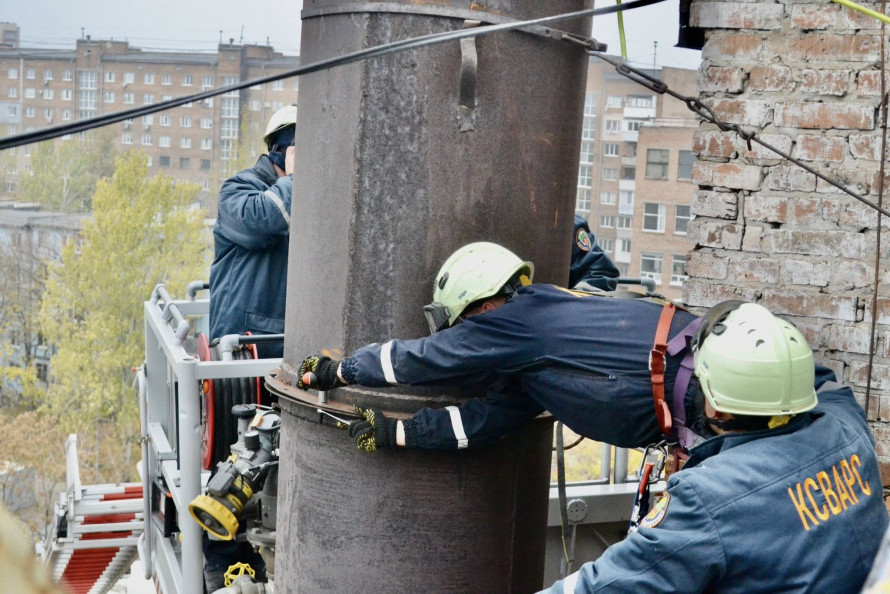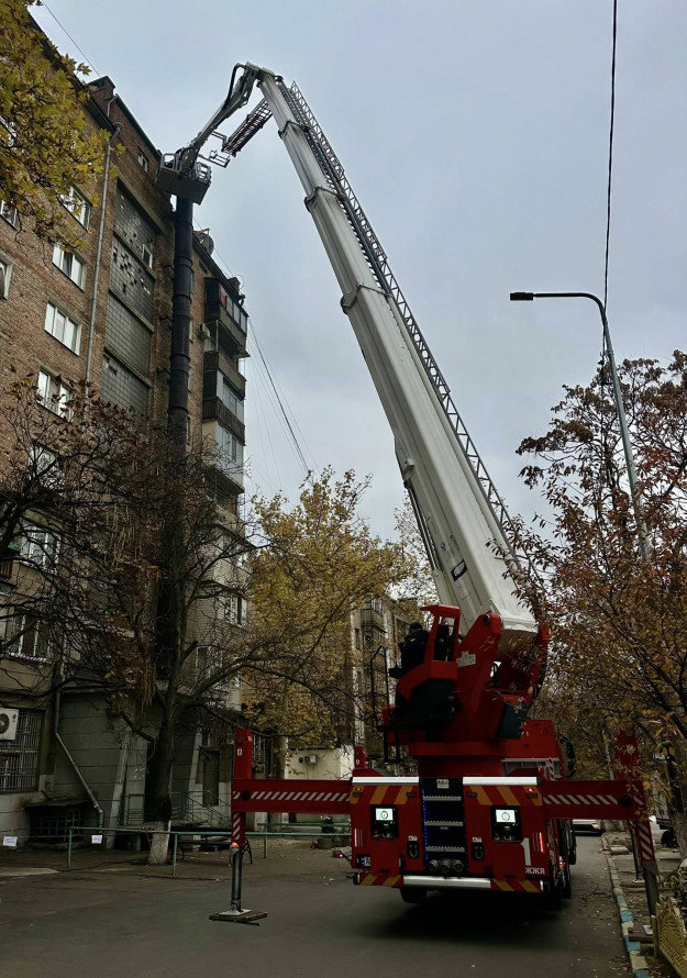 Для виконання операції залучили спеціальну техніку. Кран підняли до верхніх поверхів, де знаходилася небезпечна частина величезної металевої труби. Рятувальники КСВАРС працювали злагоджено, розуміючи відповідальність моменту.