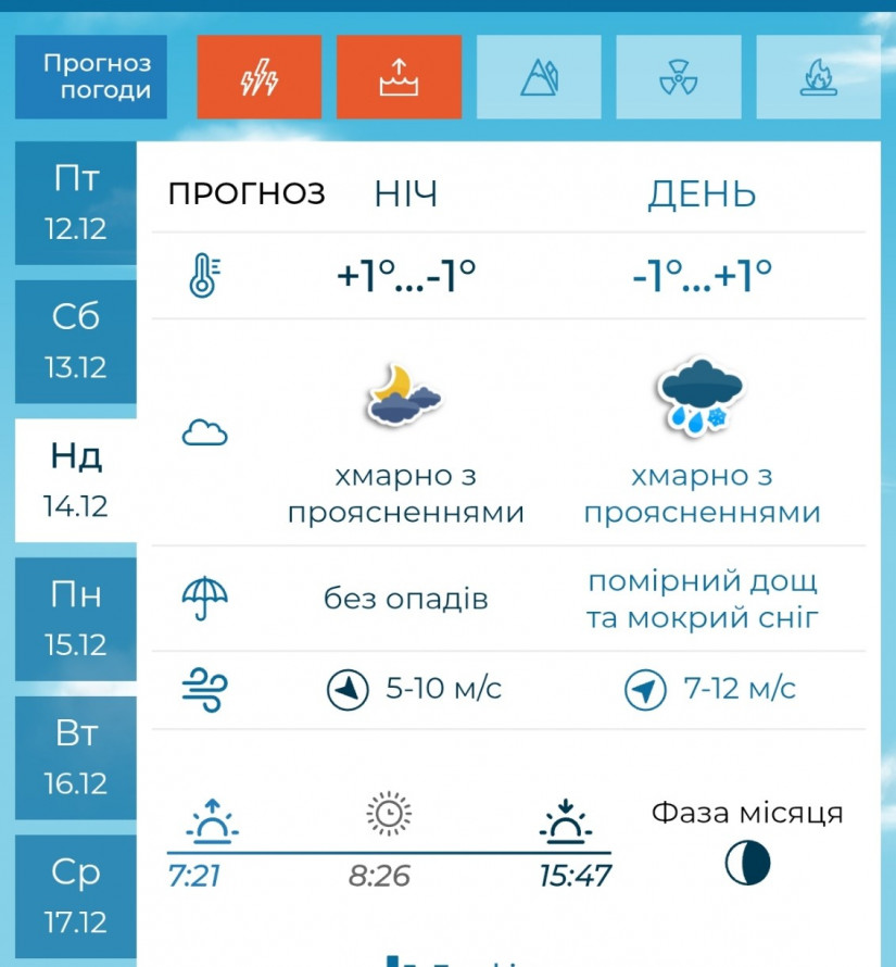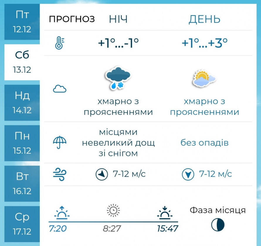 Неділя, 14 грудня, стане найскладнішим днем цього вікенду. Укргідрометцентр попереджає про мокрий сніг, налипання снігу та можливе утворення ожеледиці на дорогах. Упродовж дня можливе посилення вітру з переходом у рвучкі пориви північно-західного напрямку. Температура вночі опуститься до –5…0 градусів, удень становитиме від –3 до +2 градусів.