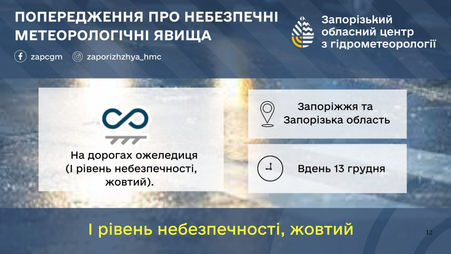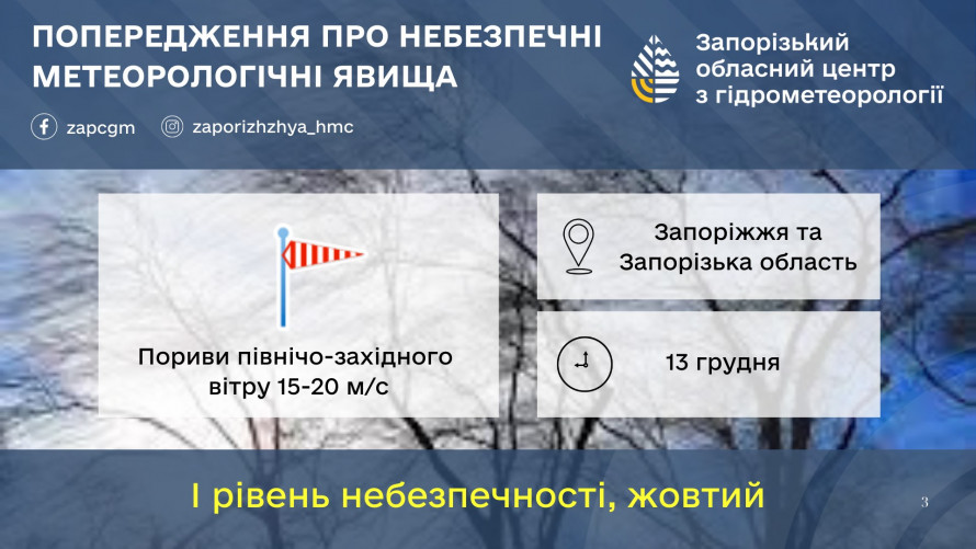 У вихідні 13 та 14 грудня Запоріжжя та область опиняться під впливом нестійких погодних процесів. Синоптики попереджають про мокрий сніг, ожеледицю та сильний північно-західний вітер, який може ускладнити пересування містом.