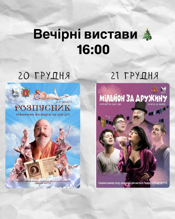 - 23, 24, 25, 26 грудня, 2, 6, 7, 8, 10, 11 січня о 10.00 - прем'єра дитяча новорічно-різдвяної вистави “Казка засніженого лісу”.