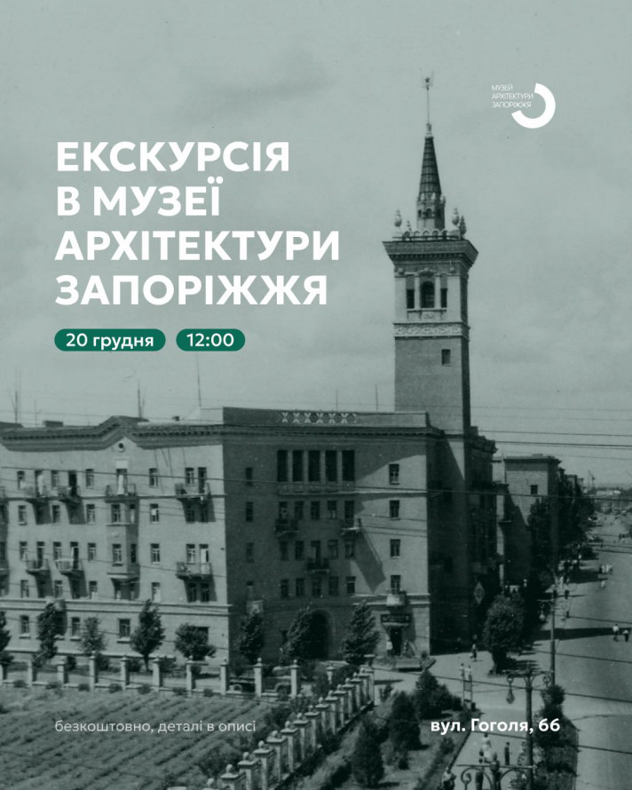 - 20 грудня о 12:00 - екскурсія "Запоріжжя архітектурне" у Музеї архітектури Запоріжжя. Безкоштовно, за попередньою реєстрацію (як зареєструватись читайте нижче).