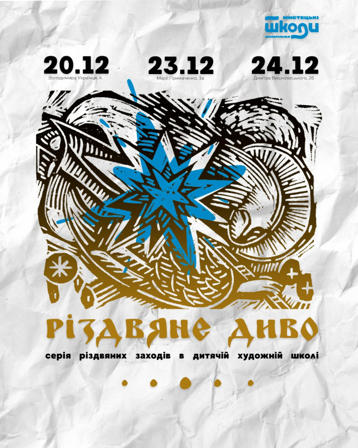 - б. Марії Примаченко, 3А: відкриття зимової виставки, перегляд мультфільму для молодших учнів, відкритий майстер-клас для дорослих (14+) з виготовлення різдвяної листівки у техніці ліногравюри для усіх бажаючих від художниці Лариси Клімової - 23 грудня о 16.00.