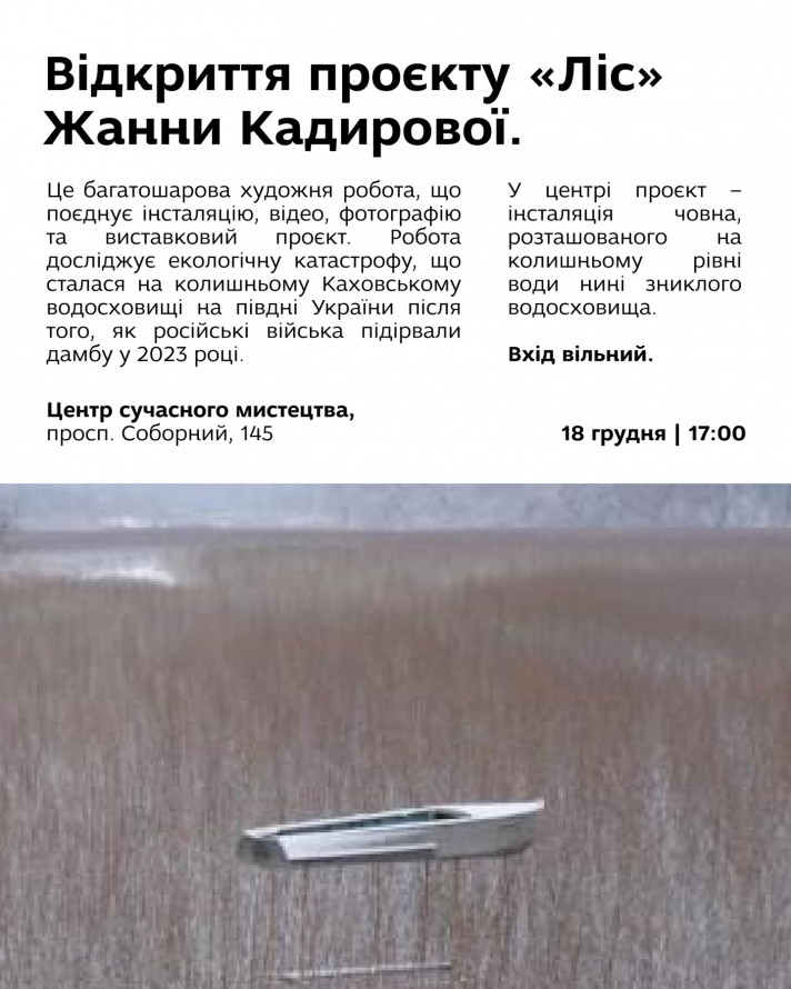 Це художній проєкт про наслідки повномасштабної війни для екології в нашому регіоні, який був створений на Хортиці. Виставку The Forest" ("Ліс") показували у Фінляндії, у Гельсинки, в Музеї електростанцій.