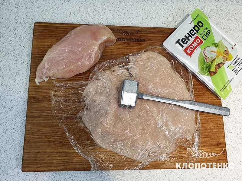 Розкрийте куряче філе «книжкою». Накрийте його харчовою плівкою і відбийте пласкою стороною молоточка, щоб не пошкодити й не розірвати волокна м'яса.