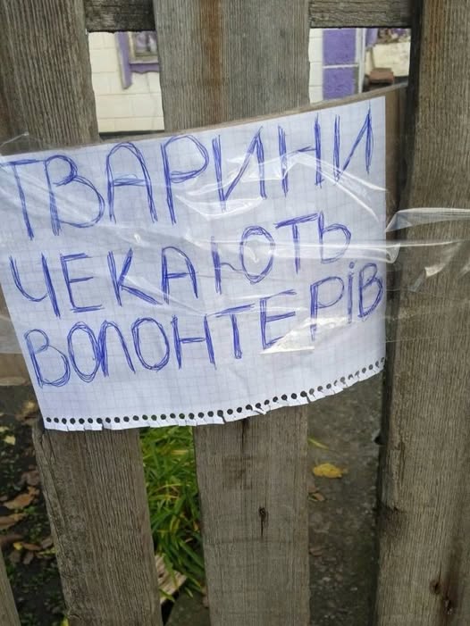 На воротах свого двору жінка залишила напис "Тварини чекають волонтерів", аби рятівники знайшли її будинок. Тетяна вирішила виїхати лише тоді, коли ворожі КАБи почали падати надто близько.