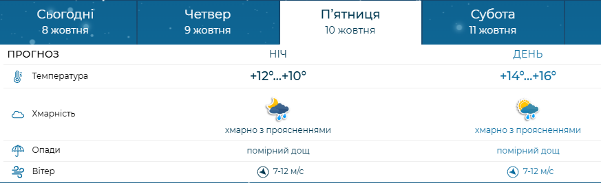 У п’ятницю, 10 жовтня, слід очікувати трохи прохолодніший день: температура знизиться до +14…+16 градусів. Хмари затягнуть небо, і синоптики прогнозують помірний дощ, який зробить атмосферу більш свіжою та вологою.