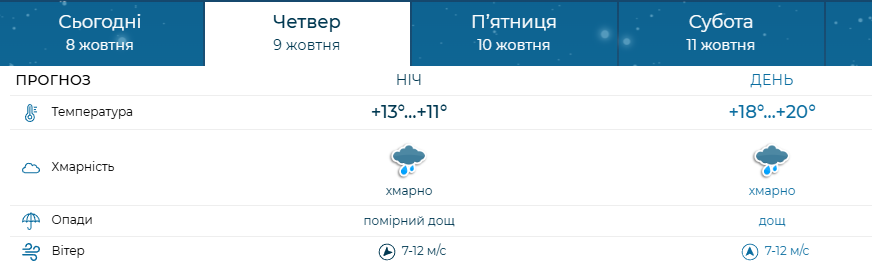 За прогнозами Укргідрометцентру, у четвер, 9 жовтня, вдень температура повітря коливатиметься від +18 до +20 градусів. Небо буде переважно хмарним, проте час від часу з’являтимуться прояснення, а невеликий дощ освіжить повітря та нагадуватиме про наближення повноцінної осені.