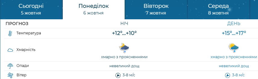 За прогнозами Укргідрометцентру, в понеділок, 6 жовтня, температура повітря вдень коливатиметься від +15 до +17. Весь день буде хмарно з проясненнями, також пройде невеличкий дощ.