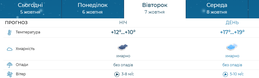 У вівторок, 7 жовтня, буде трішечки тепліше: від +17 до +19. Хмарність збережеться, проте дощів не прогнозують.