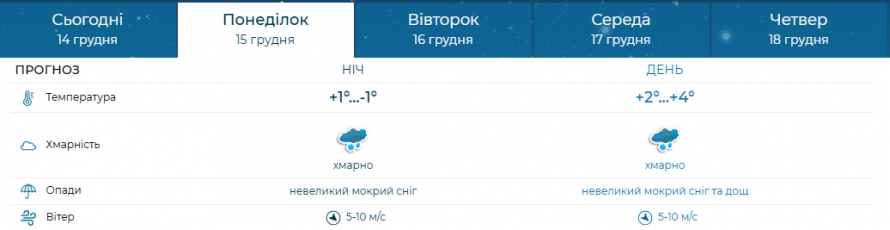 У нічні години температура повітря коливатиметься в межах від +1 до -1 градуса. Очікується хмарна погода, можливий невеликий мокрий сніг. Вітер — 5–10 м/с. Удень повітря прогріється до +2…+4 градусів, збережеться хмарність, подекуди можливий мокрий сніг із дощем.