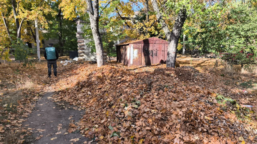 Величезна купа опалого листя, схоже ще з минулої осені, пластикові пакети, коробки, великі пластикові та металеві миски, ганчір'я та щось схоже на валізи чи футляр з-під музичного інструмента. Вся ця "краса" розташована поряд з іржавим гаражем.