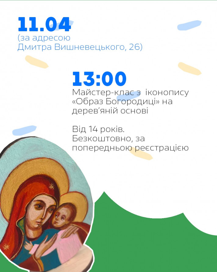 Іконопис (вул. Д. Вишневецького, 26) за посиланням: https://forms.gle/TP9BzY7DqmgaKn1L8