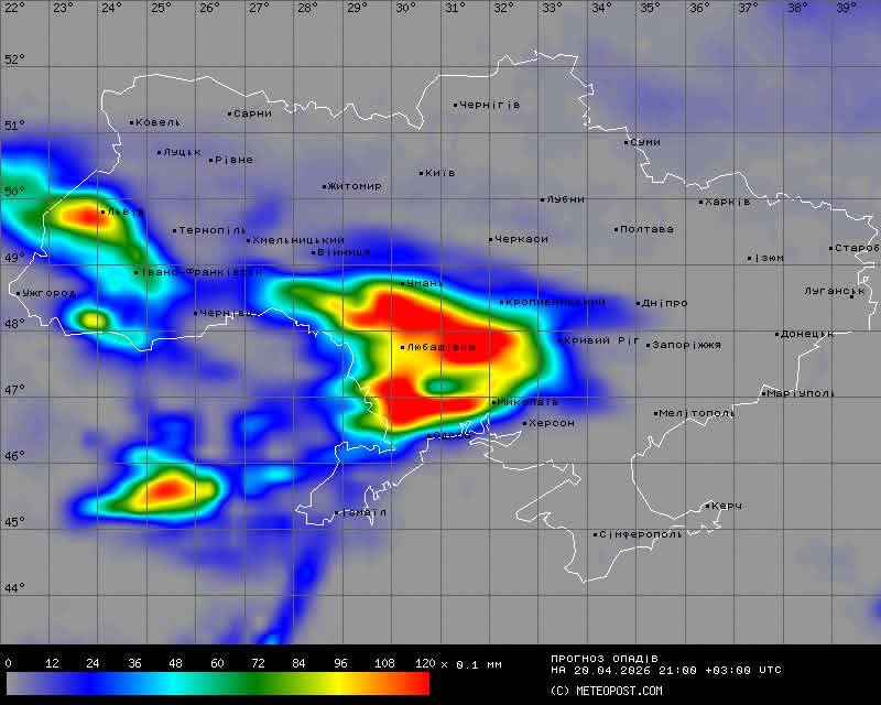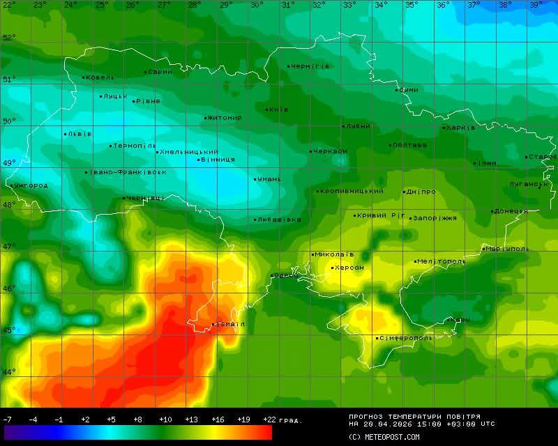 У вівторок, 21 квітня, погода різко зміниться: атмосферні фронти принесуть дощі різної інтенсивності. Вночі очікуються помірні, місцями значні опади при температурі +6…+8°C. Вдень дощі продовжаться, а температура знизиться до +11…+13°C. Вітер посилиться до 7–12 м/с і змінить напрямок з південного на північний.