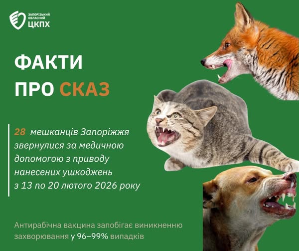 Упродовж тижня — з 13 по 20 лютого — до медичних закладів Запоріжжя по допомогу звернулися 28 містян, які отримали ушкодження від тварин. Серед них — троє дітей. Про це повідомили у пресслужбі Запорізького обласного центру контролю та профілактики хвороб.