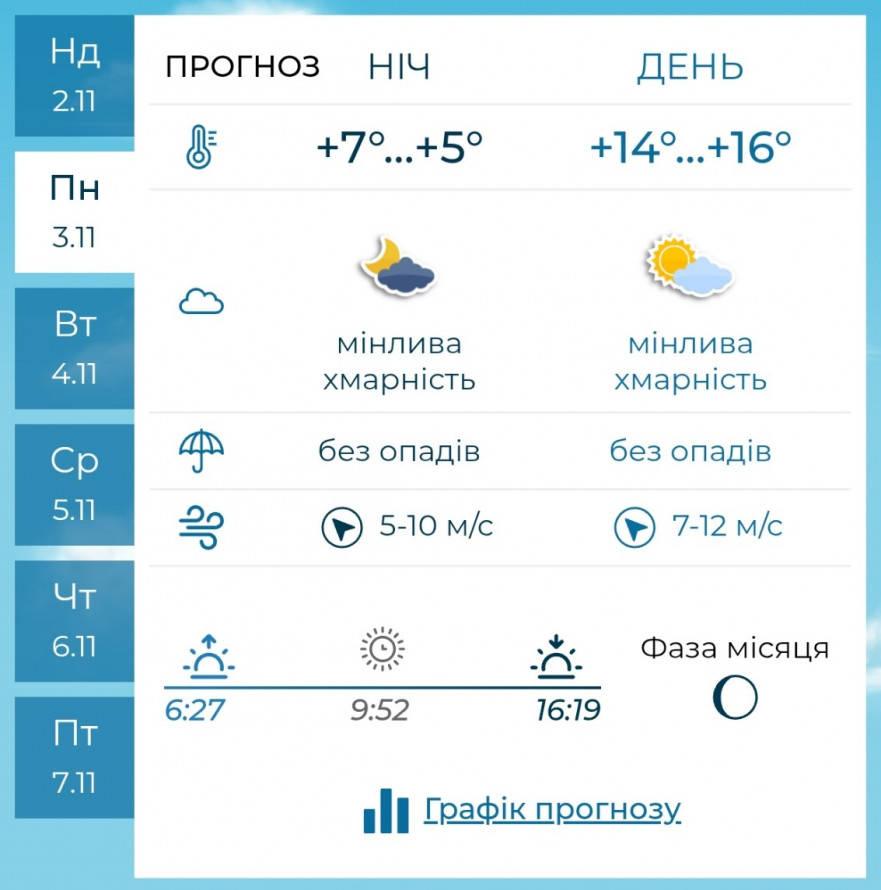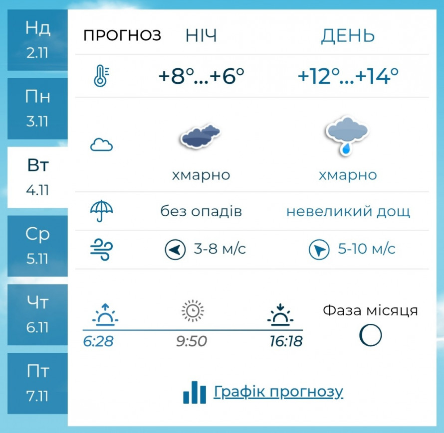 Ситуація зміниться у вівторок, 4 листопада. Ніч обіцяє бути хмарною, але ще сухою, з температурою +6°…+8°C. Східний вітер послабшає до 3-8 м/с.