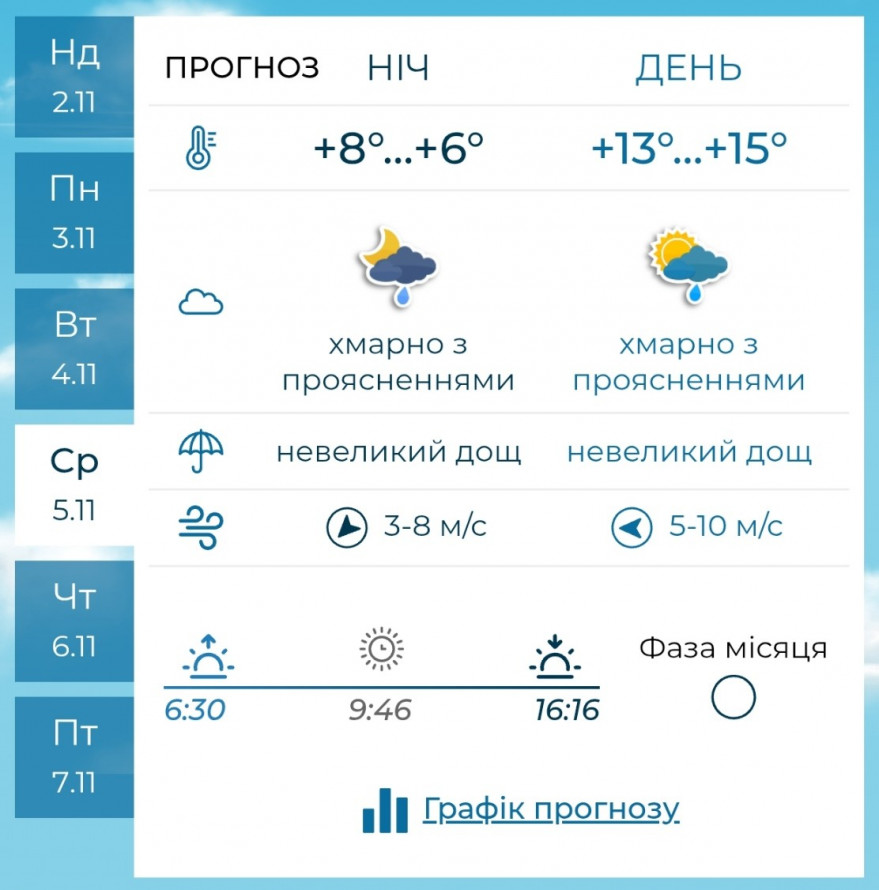 У середу, 5 листопада, дощова погода збережеться. Ніч буде хмарною з проясненнями, з невеликим дощем та температурою +6°…+8°C. Північно-східний вітер дутиме помірно – 3-8 м/с. День принесе аналогічні умови: хмарність з проясненнями, тимчасові опади та температура +13°…+15°C при східному вітрі 5-10 м/с.