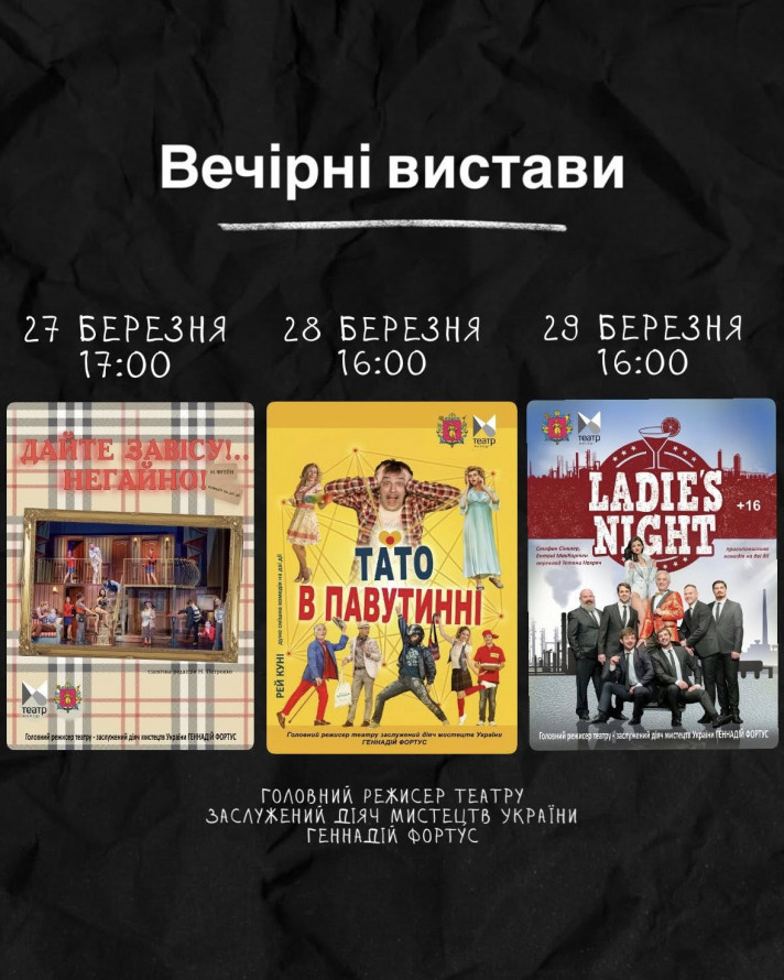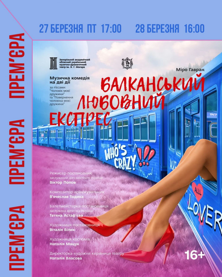 - 27 березня о 17.00, 28 березня о 16.00 - прем'єра музичної комедії на дві дії "Балканський любовний експрес", 16+. За п’єсами "Чоловік моєї дружини" та "Повернення чоловіка моєї дружини" Миро Гаврана. Режисер - Віктор Попов.