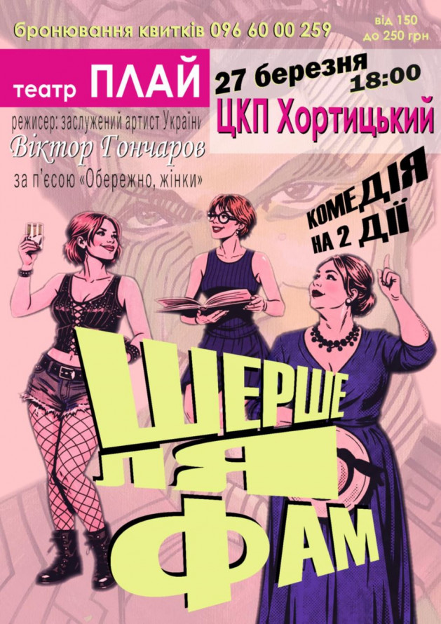 - 27 березня о 18.00 - прем'єра комедії "Шерше ля фам", 13+. Режисер - Віктор Гончаров. У театра немає свого приміщення, виставу покаже на сцені ЦКП "Хортцький" (просп. Інженера Преображенського, 15).