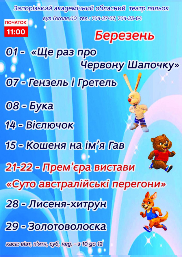 Зазначимо, що у театрі ляльок показали прем'єру 21 і 22 березня - виставу "Суто австралійські перегони" режисера Олега Лубенця. Вона поставлена за мотивами казки братів Грімм "Заєць та Їжак", тільки дія перенесли у Австралію, а зайця та їжака перетворили на кенгуру та вомбата.